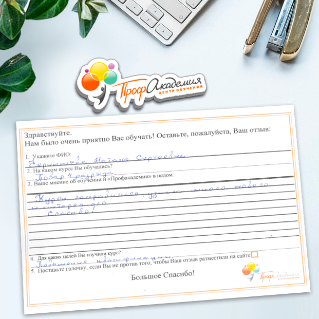 Я в восторге, давно не училась, было страшно начинать, но когда начала обучение, понравилось, все доступно, текст понятен, очень хотелось после чтения задания сразу пройти тест. Персонал академии выслал все документы на почту. Спасибо всем с кем я общалась во время обучения. Дальнейших успехов в работе.