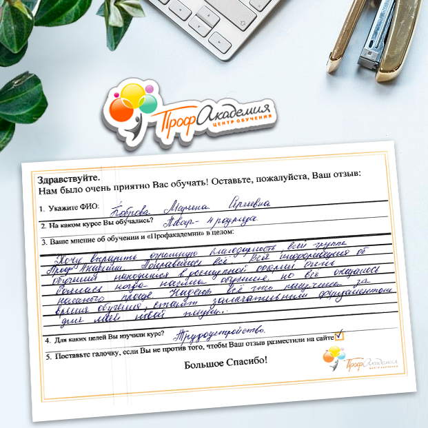 Хочу выразить огромную благодарность, всей группе ПрофАкадемии. Понравилось всё. Вся информация об обучении находится в доступной форме. Очень боялась когда нашла обучение, но всё оказалось намного проще. Надеюсь всё что научилась за время обучения, станет замечательным фундаментом для моей новой жизни.