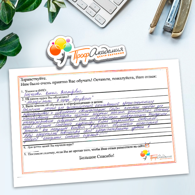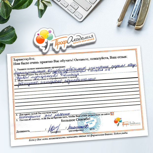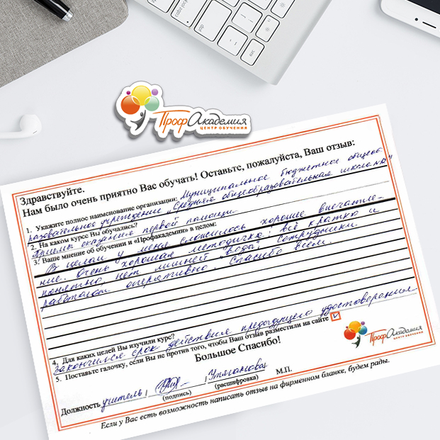 У всех педагогов нашей школы только положительные впечатления от обучения в "Профакадемии" Учебный материал очень интересный. Есть и презентации, и видеоматериалы. Все воспринимается легко и доступно. Все подтемы разложены по полочка, очень удобно для изучения! Очень вам благодарны, планируем и дальнейшее обучения в вашей Академиии.